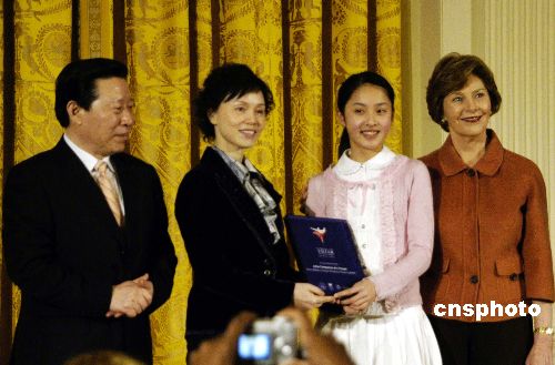 中國文化部部長孫家正(左一)今天上午在美國白宮與美國總統夫人勞拉·布什(右一)一起向中國福利會上海少年宮“小伙伴藝術團”代表陳白樺老師(左二)、李蒙初同學(右二)頒發“站得更高”獎狀。中新社發 邱江波 攝
