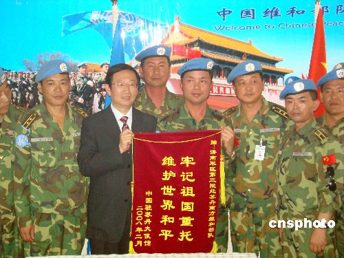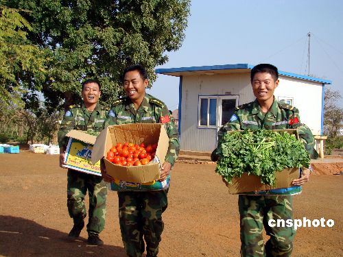 當(dāng)?shù)貢r間2月3日下午,中國駐蘇丹大使李成文在董建東武官的陪同下,帶領(lǐng)中國石油天然氣集團(tuán)公司代表一行5人乘專機前往蘇丹南部城市瓦烏,慰問中國駐蘇丹維和工兵、運輸、醫(yī)療分隊。李大使代表中國駐蘇丹大使館向維和部隊贈送一面鑲有“牢記祖國重托、維護(hù)世界和平”字樣的錦旗及慰問品。隨同的中國石油天然氣集團(tuán)公司代表向維和部隊贈送1000余公斤新鮮蔬菜。中新社發(fā) 劉恩海 攝
