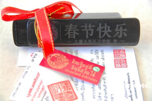 孔敬大學(xué)的校領(lǐng)導(dǎo)、各學(xué)院的院長(zhǎng)、孔敬市的華僑領(lǐng)袖,以及中小學(xué)校長(zhǎng)們都收到了來自孔子學(xué)院的禮物——一枚中國印章,上刻有他們的音譯中國名字,并附有泰文說明,說明中國名字的意義、印章的功能和歷史發(fā)展。