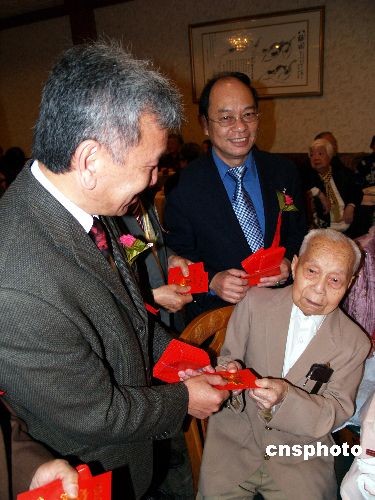 圖為中華會館主席伍競群等僑領特向101歲的老人周榮福發紅包。