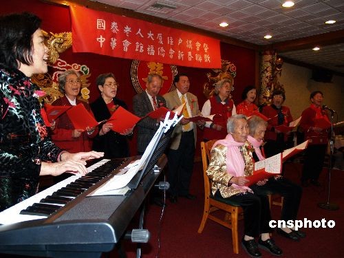 2月14日,適逢情人節,美國洛杉機中國城國泰老人大廈300多位華人耆老歡聚聯歡,這些年均年齡80歲的老人們現場唱起了“青春之歌”。中新社發 盧威 攝