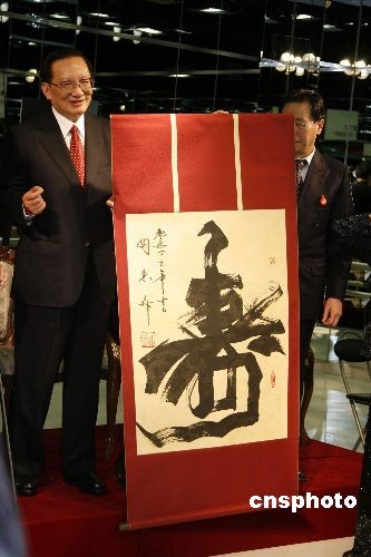 中國國務委員唐家璇2月20日下午抵達日本后即趕往日本松山芭蕾舞團,拜訪為中日友好曾作出過突出貢獻的該團創始人清水正夫和松山樹子夫婦、及該團現任總代表清水哲太郎、團長森下洋子等。圖為唐家璇在松山芭蕾舞團獲贈大幅“壽“字書法作品。中新社發 朱沿華 攝
