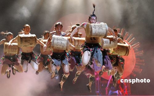 3月14日晚,在中國引起巨大轟動的大型原生態歌舞集《云南映象》在日本的時尚策源地澀谷的文化村舞臺上演,其藝術總監楊麗萍隨之成為媒體追逐的焦點。圖為《云南映象》的第一幕《太陽》演出中的場景。中新社發 朱沿華 攝