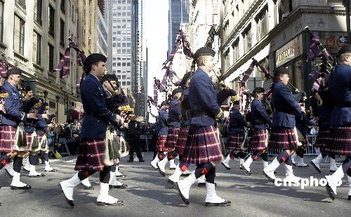 圖為身著愛爾蘭民族服飾的游行隊伍走過第五大道。