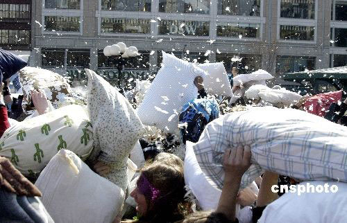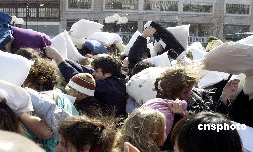 3月22日,紐約數(shù)百名青年聚居在曼哈頓聯(lián)合廣場展開一年一度的枕頭大戰(zhàn)。大家用睡了一個冬天的枕頭將彼此“砸醒”,笑迎春天的到來。中新社發(fā) 鄧悅 攝