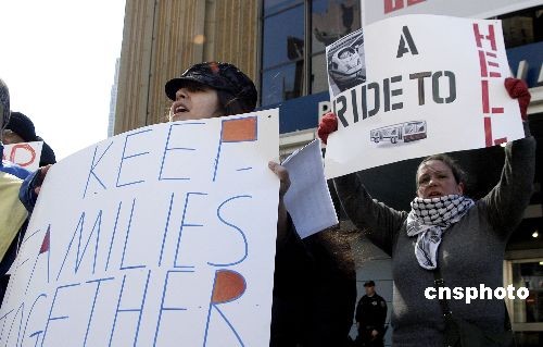 4月2日,紐約移民權益保護組織在曼哈頓的賓州車站舉行示威,抗議美國鐵路公司和長途汽車公司配合執(zhí)法當局逮捕和拘禁搭乘這些交通工具的非法移民。中新社發(fā) 鄧悅 攝