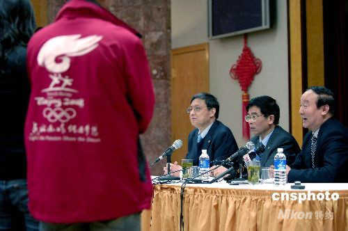 當地時間四月十日,中國駐美大使周文重(右三)和北京奧組委執行副主席蔣效愚(右一), 在舊金山舉行記者會,感謝華人華僑對北京奧運會的支持和美國人民對圣火傳遞的熱情參與。中新社發 陳鋼 攝