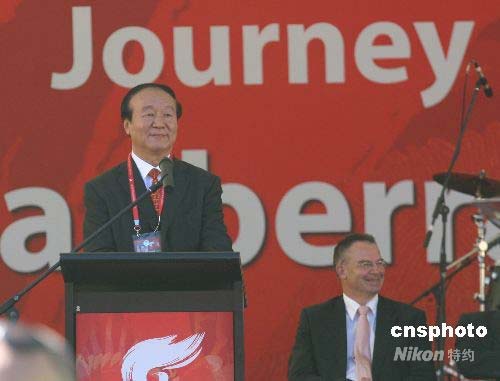 4月24日中午11時(shí)35分,北京奧運(yùn)圣火在澳大利亞首都堪培拉的傳遞順利結(jié)束。北京奧運(yùn)圣火在堪培拉的傳遞從和解廣場開始后,途經(jīng)戰(zhàn)爭紀(jì)念館、高等法院、國家圖書館、國會大廈等地,最終于中午12時(shí)左右在聯(lián)邦公園點(diǎn)燃圣火盆并舉行慶典儀式。堪培拉傳遞路線全長約15公里,80位火炬手,平均每人傳遞190米左右。圖為北京奧組委執(zhí)行副主席蔣效愚(左)在慶典儀式上致辭。