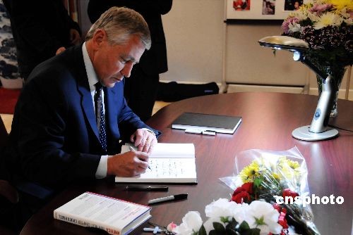 美國國會參院外交關系委員會成員、聯邦參議員恰克·黑格爾,當地時間五月十九日傍晚來到中國駐美國大使館悼念中國四川大地震遇難者。圖為黑格爾參議員在悼念紀念冊上留言:我為那些在四川大地震中遇難的中國人民感到悲痛,我堅信中國人民在政府的支持下能夠克服目前的困難。
