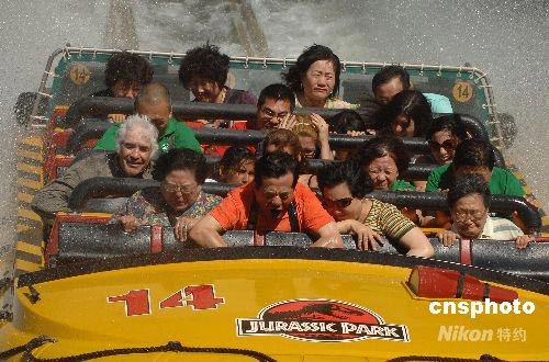 當地時間六月十八日,來自北京的旅游團成員在好萊塢“侏羅紀公園”享受驚險刺激。該旅游團于十七日晚抵達洛杉磯,他們是美國向中國旅游團正式開放后抵達洛杉磯的首批中國內地游客,共有七十多人,以中老年人為主。他們將在美國東西海岸主要旅游城市停留十二天至十三天,每位游客的團費約兩萬元人民幣。中新社發 張煒 攝