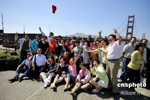 當(dāng)?shù)貢r(shí)間六月二十四日,三十九位來自中國上海的中國公民赴美旅游首發(fā)團(tuán)在舊金山著名地標(biāo)金門大橋前歡呼雀躍,合影留念。舊金山是該團(tuán)美國境內(nèi)游的最后一站。中新社發(fā) 陳鋼 攝