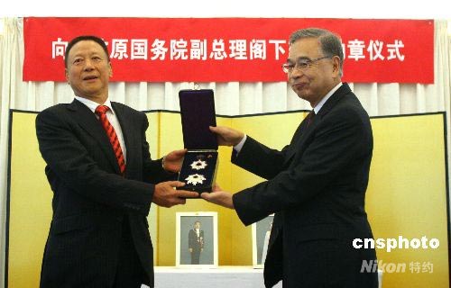 6月30日,日本授予中國前國務院副總理谷牧(本名劉家語)先生旭日大勛章。谷牧也是第二位被授予這一榮譽的中國人。圖為日本國駐華大使宮本雄二(右)向谷牧先生長子贈送勛章。谷牧先生本人因身體原因未能出席本次授勛儀式。中新社發 富田 攝