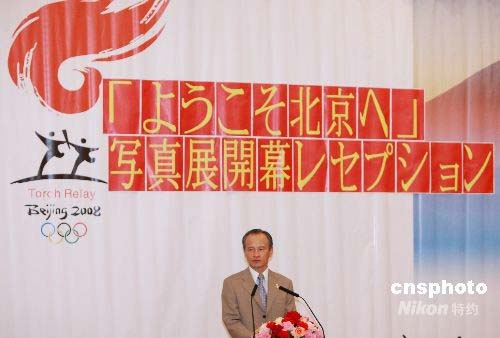 7月23日中午,由中國駐日使館主辦的《北京歡迎你》圖片展在東京開幕。此次共展出94幅奧運題材攝影作品,從古都風貌、場館建設、喜迎奧運等多個側面全面展示了中國為舉辦一屆成功奧運會所取得的杰出成就。圖為中國駐日大使崔天凱在圖片展開幕式上致詞。中新社發 朱沿華 攝