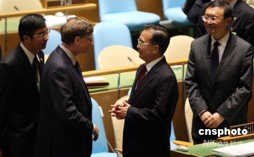 25日,中國總理溫家寶出席聯合國千年發展目標高級別會議時與前微軟總裁比爾·蓋茨進行短暫交談。中新社發 李靜 攝