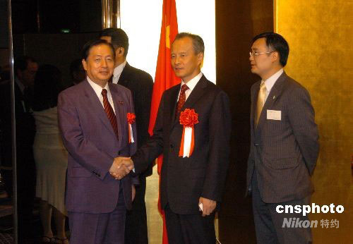9月26日晚,中國駐日大使崔天凱在東京舉行盛大的國慶招待會,與日本各界人士、在日華僑華人代表共慶中華人民共和國成立五十九周年,一千五百余人應邀出席。圖為日本執(zhí)政黨之一的公明黨黨首太田昭宏(左)出席招待會時與崔天凱大使交流。中新社發(fā) 段躍中 攝