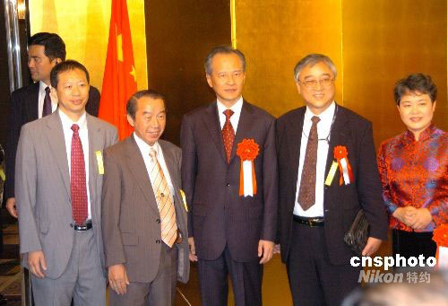9月26日,中國駐日大使崔天凱在東京舉行盛大的國慶招待會,與日本各界人士、在日華僑華人代表共慶中華人民共和國成立五十九周年,一千五百余人應邀出席。出席招待會的華 僑華人紛紛為“神舟七號”載人飛船成功發(fā)射而感動,對祖國科技的迅速發(fā)展感到自豪。圖為橫濱華僑華人代表與崔天凱大使合影。中新社發(fā) 段躍中 攝