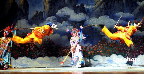 齊淑芳京劇團(tuán)在“世界舞臺(tái)系列”演出。今年是齊淑芳京劇團(tuán)在美國成立20周年,應(yīng)紐約大學(xué)SKIRBALL中心的邀請(qǐng),10月5日,該團(tuán)以《楊門女將》參加由十個(gè)國家輪流表演的“世界舞臺(tái)系列”中演出,為讓不懂漢語的觀眾看懂京劇《楊門女將》,齊淑芳京劇團(tuán)在百老匯演出的腳本上作了重大修改,減少唱段,增加武打,使文戲動(dòng)聽,武打精彩,劇情緊湊。中新社發(fā) 龔文謨 攝