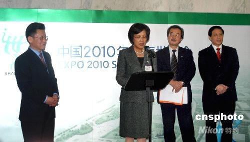 當地時間十月六日,“上海世博會聯合國圖片展”在紐約聯合國總部開幕。上海世博會執委員常務副主任鐘燕群(中)介紹上海世博會籌備情況。聯合國副秘書長沙祖康(左)、副秘書長赤阪清隆(右二)和中國常駐聯合國代表張業遂出席開幕式(右)。該圖片展由上海世博會事務協調局、中國常駐聯合國代表團和上海市對外文化交流協會共同舉辦。中新社發 汪晨 攝