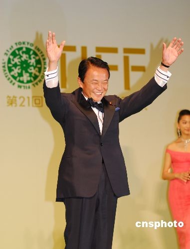 10月18日傍晚,第21屆東京國際電影節(jié)開幕。以“環(huán)保”為主題的本屆電影節(jié)別出心裁地將星光大道的地毯由紅色改為綠色。上個月剛剛當(dāng)選日本首相的麻生太郎與開幕影片《赤壁》劇組成員同走綠地毯,成為第一個光臨東京國際電影節(jié)現(xiàn)場的日本總理大臣。中新社發(fā) 侯宇 攝