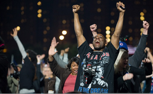 美國總統選舉結果揭曉,奧巴馬已經贏得足夠的選舉人票(270票),取得本屆美國總統大選的勝利。他將成為美國首位黑人總統。圖為支持者慶祝奧巴馬的獲勝