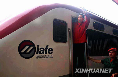 委內(nèi)瑞拉總統(tǒng)查韋斯站在一輛停放在亞拉圭州的中國(guó)制造動(dòng)車組駕駛室門口揮手。