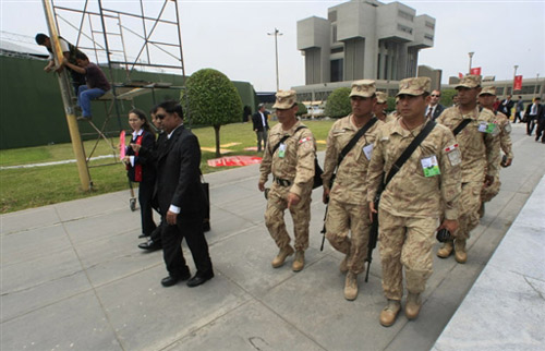 峰會期間,秘魯方面將安排3.9萬名警察在大街上巡邏,并用直升機將護送領(lǐng)導人衛(wèi)隊,而領(lǐng)導人們則將在戒備森嚴的秘魯國防部內(nèi)會面。