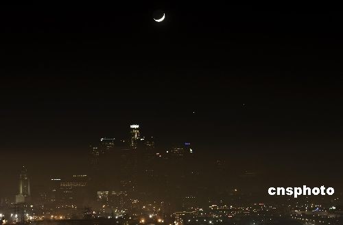 當地時間十二月一日晚七時許,洛杉磯市中心上空西南方出現“雙星拱月”的少見天象,耀眼的金星(左)和明亮的木星(右)伴隨著一彎新月在夜空中格外醒目。據天文學家介紹,這三個天體盡管每年有一次相遇的機會,但肉眼可見的時候卻很少。中新社發 張煒 攝