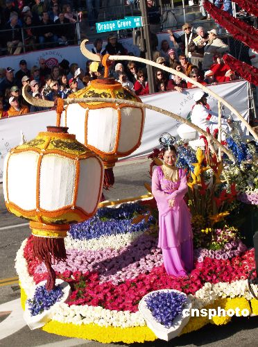 當(dāng)?shù)貢r間1月1日,第120屆美國帕薩迪娜玫瑰花車游行拉開2009新年序幕。游行隊(duì)伍由90個方陣組成,包括46輛花車、22支軍樂隊(duì)、18支騎術(shù)隊(duì)和5輛禮賓車,美輪美奐,精彩紛呈。臺灣中華航空公司的玫瑰花車“火鳳凰”,在花車游行中勇奪國際大獎。該花車名為“臺灣燈會”,花車上凸顯中國燈籠和“仙女下凡”,奪人眼球。中新社發(fā) 盧威 攝