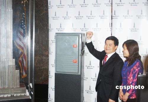 1月23日起,美國(guó)紐約著名的標(biāo)志性建筑帝國(guó)大廈,將連續(xù)4天在大廈頂端點(diǎn)亮象征中國(guó)的一千三百二十七盞紅黃兩色彩燈,以慶祝中國(guó)農(nóng)歷新年的到來(lái)。圖為中國(guó)駐紐約副總領(lǐng)事董曉軍及夫人出席了當(dāng)天的亮燈儀式,并共同拉下象征啟動(dòng)的電閘。中新社發(fā) 魏晞 攝