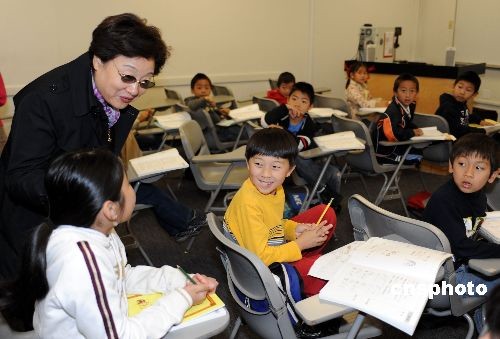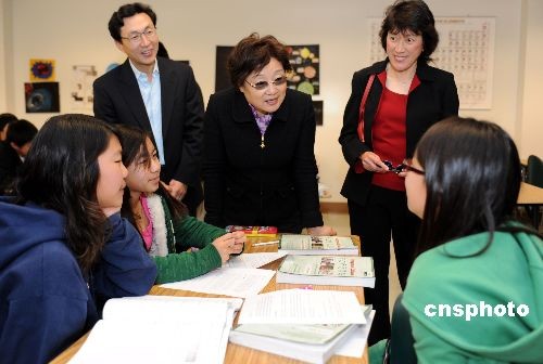當地時間二月八日,中國國務院僑辦主任李海峰(中)來到美國加州圣地亞哥華夏中文學校參觀訪問,并與學生進行面對面交流,了解他們的家庭語言環境和中文學習進展。據了解,從今年開始,國僑辦將在海外遴選一批“華文教育示范學校”,并在教材、師資等方面提供幫助與扶持。中新社發 張煒 攝