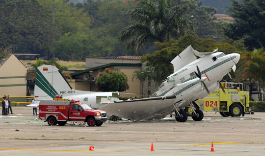 2月18日,哥倫比亞國家警察的一架DC-3飛機在麥德林的一個機場發(fā)生爆炸,造成至少8名警察受傷。圖為爆炸的飛機殘骸癱在停機坪上。