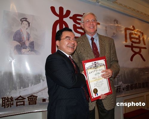 當地時間2月19日,“揚州紅樓飲食文化節”在美國洛杉磯金都凱旋皇宮大酒店開幕,這是華夏“紅樓宴”首次登陸北美。洛杉磯縣政委員會主席安東諾維奇頒賀狀歡迎揚州市副市長王玉新率揚州紅樓飲食文化代表團訪美。中新社發 盧威 攝