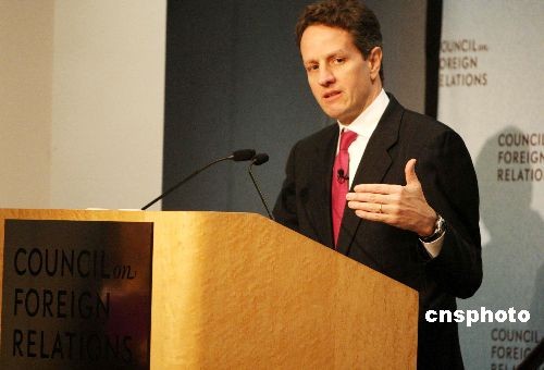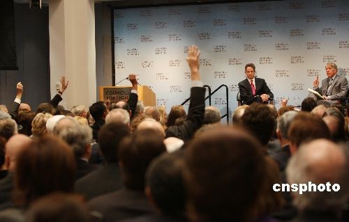 25日,美國財政部長蓋特納在位于紐約的美國外交關系協會(CFR)發表演講時表示對美元很有信心,“美元的基礎地位應該不會改變”。蓋特納同時表示,政府應該對金融公司有更大的控制權。圖為蓋特納接受美國外交關系協會會員提問。中新社發 魏晞 攝