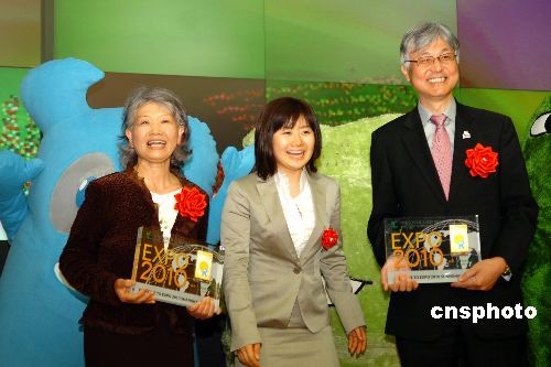 4月11日下午,上海世博組委會在東京舉行“魅力上海,精彩世博——2009日本上海世博推薦周”開幕式。上海市常務副市長楊雄和上海世博會日本推廣形象大使福原愛共同向“超級世博迷”山田外美代及日本觀光廳長官本保芳明贈送了第一張世博門票。日本家庭主婦山田外美代在2005年愛知世博會期間創下了每天入場、總入場數達二百四十三次的紀錄,被日本媒體授予“世博全勤獎”。圖為福原愛(中)與山田外美代(左)、本保芳明(右)在開幕式上。中新社發 朱沿華 攝