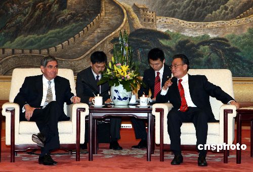 十月二十五日,吳邦國委員長在北京人民大會堂會見哥斯達黎加總統阿里亞斯。中新社發 任海霞 攝