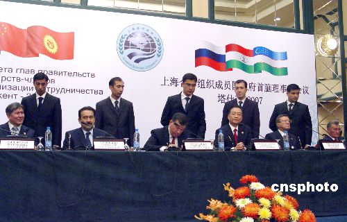十一月二日,在烏茲別克斯坦首都塔什干舉行的上海合作組織總理第六次會議結(jié)束后,六國總理簽署了聯(lián)合公報等文件,并共同會見了記者。中新社發(fā) 孫宇挺 攝