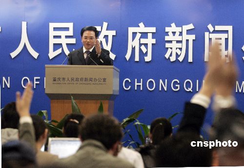 11月15日,重慶市人民政府舉行首場自主新聞發(fā)布會,就三峽移民、交通改造和建設(shè)、醫(yī)療保險、物價上漲、城鄉(xiāng)統(tǒng)籌試驗區(qū)等當(dāng)?shù)厥忻窈蛧鴥?nèi)外媒體關(guān)注的問題進(jìn)行回答。重慶市是繼上海市后第二個舉行自主新聞發(fā)布會的中國城市。據(jù)悉,重慶自主新聞發(fā)布會目前暫定每月一次,定為每個月的第二個星期四下午舉行。中新社發(fā) 郭晉嘉 攝