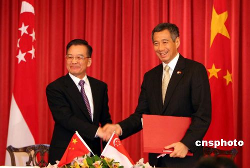 到訪的中國國務院總理溫家寶十一月十八日在新加坡總統府與新加坡總理李顯龍共同簽署了兩國合作建設中新天津生態城框架協議。“生態城”項目的地點選定在中國天津。中新社發 周群 攝