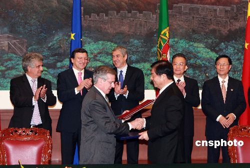 十一月二十八日,北京人民大會堂,中國國務院總理溫家寶會見歐盟輪值主席國葡萄牙總理索克拉特斯(后左三)與歐盟委員會主席巴羅佐(后左二),并在會見后共同出席中國與歐盟三項合作文本的簽字儀式。中新社發 廖文靜 攝