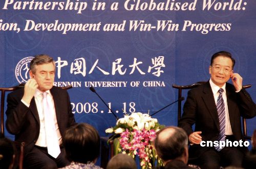 十八日下午,中國總理溫家寶與來華訪問的英國首相布朗一起來到中國人民大學,與中英兩國的公眾代表進行交流,共同回答兩國公眾關心的問題。中新社發 周兆軍 攝