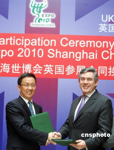 1月19日,上海市市長韓正(左)在上海會見來華訪問的英國首相戈登·布朗。并與布朗互換中國二○一○年上海世博會參展文本。中新社發 湯彥俊 攝