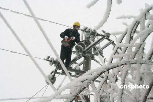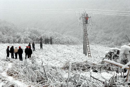 1月20至21日,黔東南州各縣電力職工在搶修受冰凍災害的電力設施。連日來,由于持續出現大范圍雪凝天氣,貴州省黔東南州境內的凱里電網(轄管黔東南州各縣市)遭遇自1984年以來最為嚴重的冰凍災害,凱里電網部門及下屬的15家縣局已緊急采取措施,確保電網穩定運行。1月14日以來,貴州黔東南地區溫度均在零下1攝氏度,是24年以來最為嚴重的一次,出現嚴重的覆冰。覆冰導致一些輸電設施桿塔和導地線不堪重負而倒塔斷線,電網設施受損嚴重。截止1月21日,凱里電網出現孤網運行,各縣農網線路等輸配電線路都不同程度出現倒桿斷線的情況,造成黔東南州南部電網七個縣全部停電。冰災發生后,凱里電網部門迅速啟動“抗冰保電”應急預案,同時在當地媒體發布停電預警公告,并積極做好醫院、交通、通訊、礦山等重要客戶的安全用電工作。中新社發 吳如雄 攝