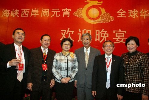 2月18日晚,中國國務院僑務辦公室、福建省人民政府和海峽兩岸關(guān)系協(xié)會在福州市舉辦晚宴,熱烈歡迎來閩參加“海峽西岸鬧元宵 全球華人盼團圓”活動的海外華僑華人、港澳同胞和臺灣同胞代表。全國人大常委會副委員長許嘉璐,國務院僑務辦公室主任李海峰,福建省人大常委會副主任王美香,福建省人民政府副省長洪捷序,福建省政協(xié)副主席張帆等出席了歡迎晚宴。圖為全國人大常委會副委員長許嘉璐、國務院僑務辦公室主任李海峰與嘉賓合影祝酒。中新社發(fā) 張勤 攝