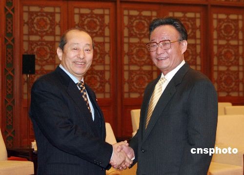 二月二十日,中國(guó)全國(guó)人大常委會(huì)委員長(zhǎng)吳邦國(guó)在北京人民大會(huì)堂會(huì)見由參議院議員大石正光率領(lǐng)的日本國(guó)會(huì)參議院代表團(tuán)。中新社發(fā) 廖文靜 攝