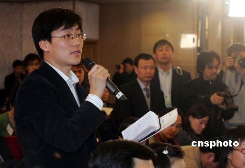 在北京人民大會堂舉行的全國政協(xié)十一屆一次會議首場新聞發(fā)布會上,中新社記者徐長安向大會新聞發(fā)言人吳建民提問。中新社發(fā) 潘索菲 攝