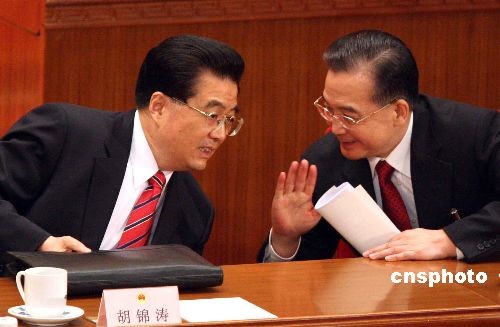 圖:胡錦濤、溫家寶人大會上交談