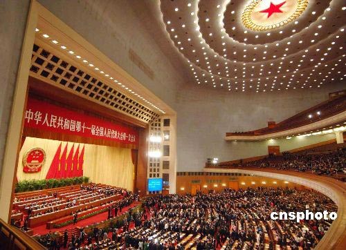 三月十五日上午,十一屆全國人大一次會議第五次全體會議在北京人民大會堂舉行,表決關于批準國務院機構改革方案的決定草案,選舉十一屆全國人大常委會委員長、副委員長,選舉國家主席、副主席及中央軍委主席等。中新社發 王東明 攝