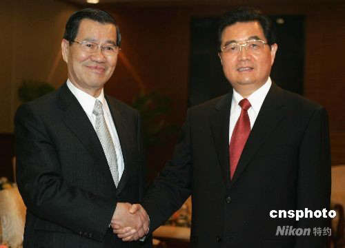 4月12日下午,中共中央總書記胡錦濤在海南省博鰲會見出席博鰲亞洲論壇2008年會的兩岸共同市場基金會董事長蕭萬長。中新社發 任晨鳴 攝