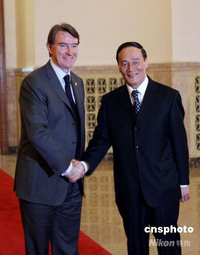 四月二十五日,首次中歐經(jīng)貿(mào)高層對話在北京人民大會堂舉行。中國國務(wù)院副總理王岐山和歐盟貿(mào)易委員曼德爾森共同主持對話。這將成為中歐間最高級別的對話平臺。 中新社發(fā) 任海霞 攝