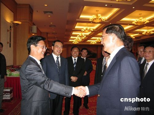 五月四日晚,中共武漢市委書記楊松宴請中國國民黨榮譽主席連戰一行。圖為楊松(左一)與武漢市市長阮成發(左二)歡迎連戰一行。中新社發 艾啟平 攝
